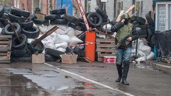 De hecho, la operación antiterrorista anunciada por las autoridades de Kiev no tuvo lugar dentro de la ciudad, donde la comisaría tomada el sábado seguía en manos de milicianos que se han hecho con las armas allí guardadas. Tres filas de barricadas protegen el acceso a la comisaría.