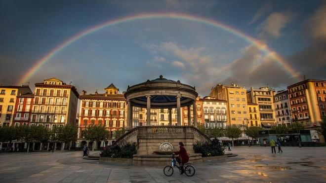 En estos días grises, marcados por el mal tiempo y la pandemia, se agradece más que nunca un poco de color. Así se pudo ver este martes por la tarde el arco iris tras una vuelta de lluvia, con toda su fuerza acompañando al colorido de las casas de la plaza del Castillo, el corazón de Pamplona, que ayer ralentizó su ritmo con la entrada en vigor de las restricciones para tratar de frenar la expansión del coronavirus en Navarra.