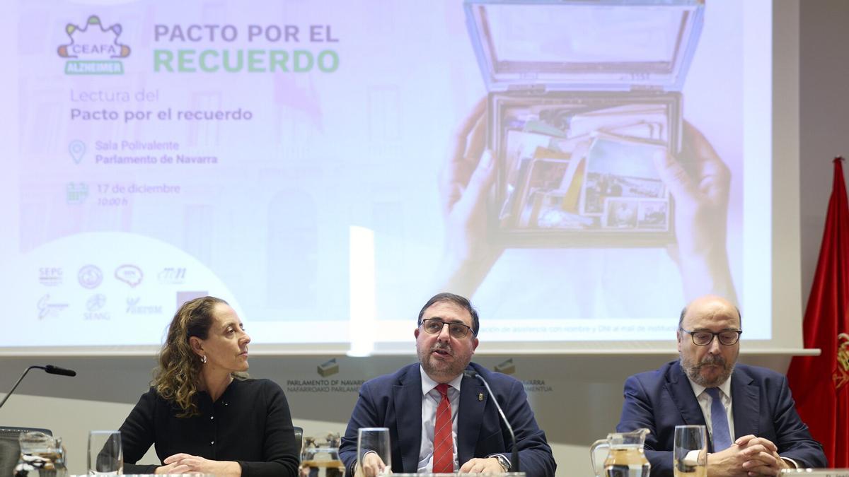 Así lo afirmó durante el acto de lectura del Pacto por el Recuerdo, organizado por CEAFA en el Parlamento de Navarra, que fue inaugurado por el presidente de la Cámara, Unai Hualde. Hualde se quiso sumar al llamamiento de CEAFA para adoptar “medidas inmediatas” en la lucha contra el alzhéimer, “una enfermedad que afecta a miles de familias y que requiere soluciones eficaces, firmes y definitivas que cuenten con el consenso de instituciones sanitarias, científicas y sociales”.