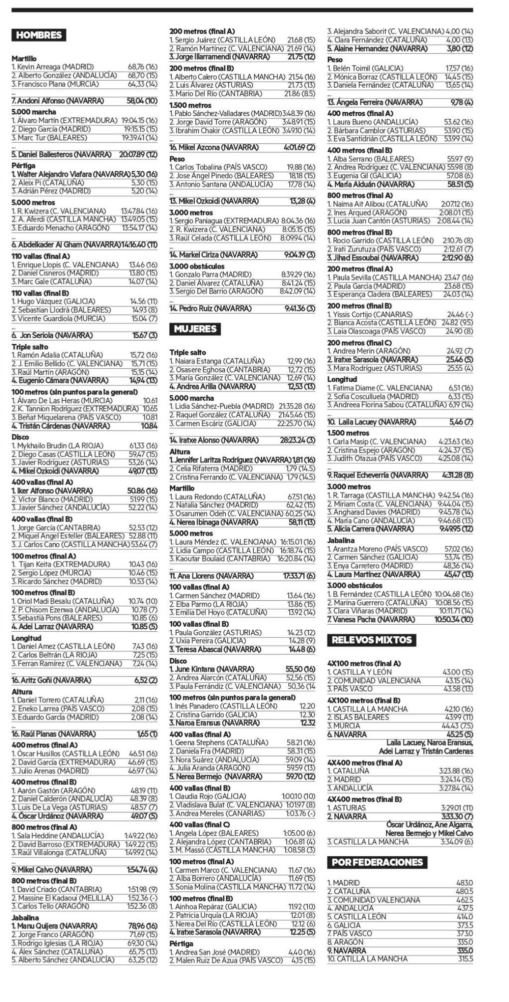 A que Navarra peleara durante buena parte de la jornada incluso por la quinta plaza (Madrid, Cataluña, Comunidad Valenciana y Andalucía se mostraron inalcanzables para el resto) y para que finalmente concluyera en la novena posición de la competición contribuyeron todos sus atletas, pero especialmente aquellos que aportaron puntuaciones con dobles dígitos, teniendo en cuenta que se repartían 16 puntos para el ganador de cada disciplina, 15 para el segundo, 14 para el tercero y así sucesivamente. Y en este capítulo destacaron Walter Alejandro Viafara (Grupompleo Pamplona Atlético), vencedor en pértiga con un salto de 5,30 metros; Iker Alfonso (Grupompleo Pamplona Atlético), que se hizo con la victoria en los 400 vallas con una marca de 50.86 segundos; Manu Quijera (Grupompleo Pamplona Atlético), que conquistó el triunfo con autoridad en jabalina con un lanzamiento de 78,96 metros; Jennifer Laritza Rodríguez (Playas de Castellón), que ganó en altura con un salto de 1,81 metros; y June Kintana (Grupompleo Pamplona Atlético), triunfadora en la prueba de disco con un lanzamiento de 55,50 metros.