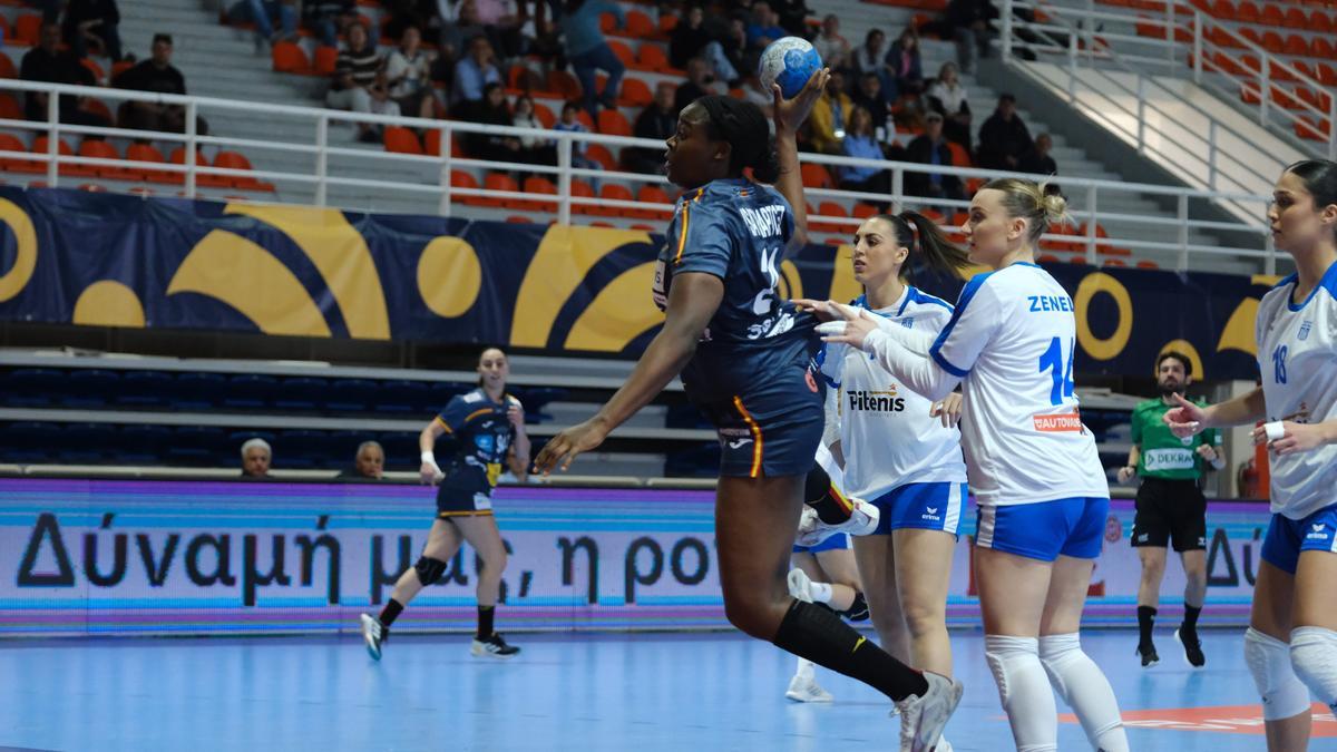 GRECIA Kepesidou (1), Kaprinioti y Tsiknaki; Kerlidi (1), Papadopoulou, Mentesidou, Gkatziou (1), Nikolina Kepesidou, Koukmisi, Samolada (10), Zeneli (2), Fragkou y Andritsou (7, 5p), Mania y Sevdili. ESPAÑA Morales y Prades; Eli Cesáreo, Vegué (2, 1p), Etxeberria (2), Lysa Tchaptchet (2), So Delgado (9, 2p), Alicia Fernández (1p), Bernabé, Elba Álvarez (2, 1p), Lyndie Tchaptchet, Arroyo, Agulló (2), Oppedal (3), Belén Rodríguez y Santomé (1).