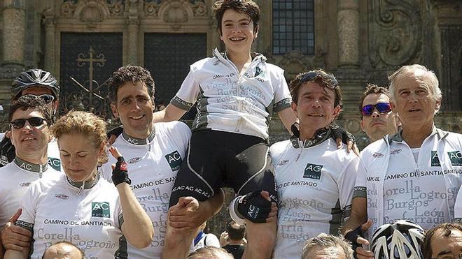 Santiago. Miguel Induráin llegó ayer a Santiago tras recorrer en seis etapas 873 kilómetros desde Corella. Induráin, que posa en la imagen con su esposa, Marisa López de Goicoechea, Serafín Zubiri y el empresario Antonio Catalán, entre otros, reveló que es "la primera vez" que llega a Santiago como peregrino, ya que en 2009 hizo un tramo del Camino junto a David Bisbal pero no alcanzó la capital compostelana. Las etapas fueron Corella-Logroño, Logroño-Burgos, Burgos-León, León-Ponferrada, Ponferrada-Sarria y Sarria-Santiago. Foto: EFE/Jorge Leal