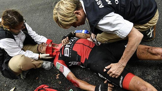 Martin, cuarto en la general a 25 segundos del líder Chris Froome (GBR/Team Sky), pudo reanudar la marcha, pero Porte tuvo que ser atendido por los servicios médicos de la carrera y evacuado posteriormente en ambulancia.