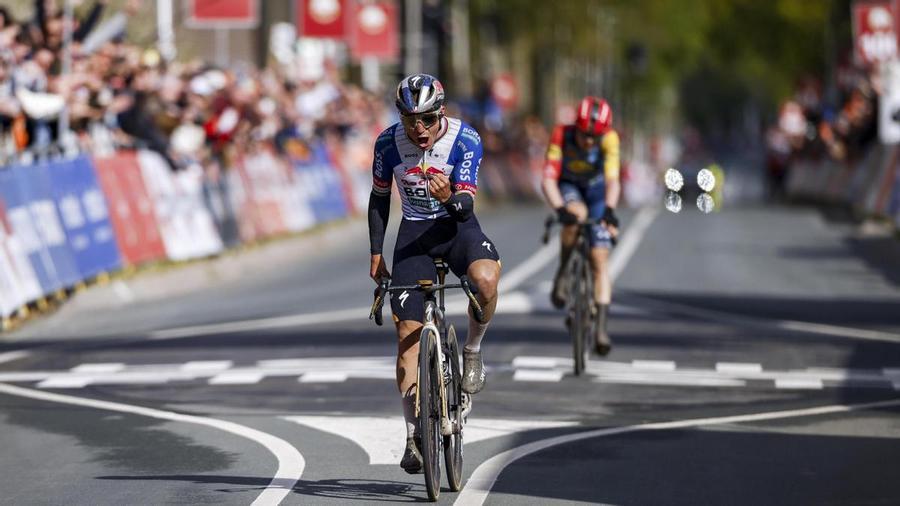 Abrochada la Amstel Gold Race por vez primera después de someter en un virulento esprint a Mattias Skjelmose, que perdió un segundo en ese duelo, abrumado por la potencia demencial de Evenepoel, desatada la camisa, rota, impetuoso.