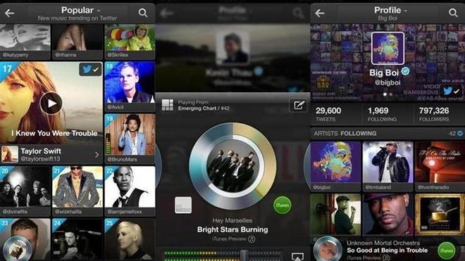 La aplicación de música cuenta con cuatro pestañas. Una de las pestañas se llama Popular y muestra la música que es tendencia en Twitter, mientras que la pestaña Emergente muestra el "talento oculto que se encuentra en los 'tuits", según la compañía.