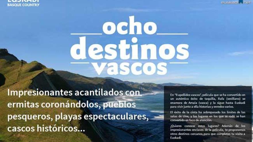 "Ocho destinos vascos" presenta otros tantos lugares con interés turístico en Euskadi, cuatro de ellos situados en Gipuzkoa (Zumaia, Getaria, Zarauz y San Sebastián), dos en Bizkaia (Urdaibai y Bilbao), y uno en Álava (Rioja Alavesa). Además, ofrece información de una serie de rutas naturales por la geografía vasca.
