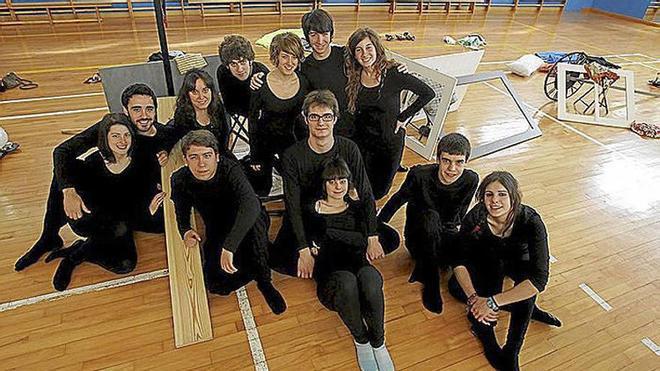 escenografía corporal Una de las peculiaridades de este espectáculo es que la escenografía "la crean los actores con sus cuerpos". Es decir, lo mismo se convierten en banco que en farola o en otro recurso necesario para contar alguna de las escenas. Y todo sucede a la vista del público, sin caja negra, de manera que el juego teatral queda al descubierto. El trabajo corporal es fruto del taller que el autor y director Álvaro Morales impartió a los componentes del grupo durante el curso y los movimientos son una aportación de Fueradeleje, que les dio unas clases de coreografía. "Siempre me gusta meter en el montaje final los distintos elementos nuevos que hemos ido aprendiendo a lo largo del curso", explica Orzaiz, que destaca, asimismo, la "gran iluminación" que han creado Mikel Larrea y Luis García.