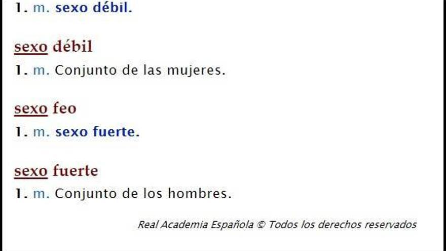 MADRID. La Real Academia tiene previsto actualizar su Diccionario de la Lengua Española (DLE) en la red el próximo mes de diciembre y entonces incluirá en la definición de la expresión "sexo débil" una marca de uso que indicará que ésta se utiliza "con intención despectiva o discriminatoria".