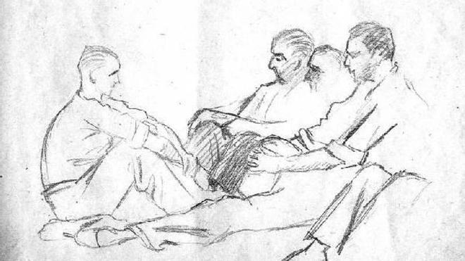 DIBUJOS DE LA CÁRCEL Ciga, pintor vocacional, también ejerció su actividad en un recinto tan poco propicio como era la celda carcelaria, pero que le sirvió para evadirse y sublimar la cruda y absurda realidad que vivió. Con la falta de medios que imponía la circunstancia, es decir, una libreta y un lápiz, realizó la serie que conocemos como “Dibujos de la cárcel”, compuesta por 18 dibujos con formato vertical y horizontal de 15 x 19 cm. Once de los cuales representan retratos de sus amigos entre los que destacan los hermanos Irujo, Aquiles Cuadra y algunos baztandarras encarcelados. Aparecen representados en todas sus modalidades: cabezas, bustos, medio cuerpo, tres cuartos, de cuerpo entero, de perfil, de frente, ladeados, etc. Los otros seis dibujos representan distintas escenas de la vida carcelaria en la que los presos pasaban su tiempo. Son dibujos minimalistas, ejecutados con unas pocas líneas, con la corrección y el rigor dibujístico que le caracterizaban y con dominio absoluto de las anatomías. Por medio del sombreado y escorzos, consigue interesantes efectos de volumetría y perspectiva. Ciga se revela como un fiel cronista de la vida carcelaria, dejándonos un documento de gran valor histórico.