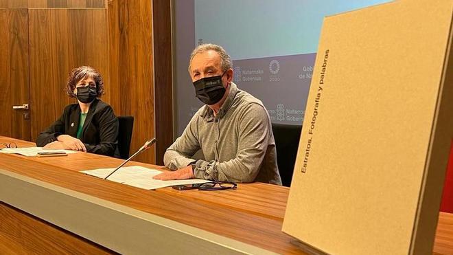La consejera de Cultura y Deporte, Rebeca Esnaola, y el fotógrafo Carlos Cánovas han presentado el libro "Estratos. Fotografía y palabras", fruto del proyecto de difusión como ganador del premio Príncipe de Viana de la Cultura 2020 que otorga el Gobierno de Navarra cada año a propuesta del Consejo Navarro de la Cultura y de las Artes y que, por primera vez en su historia, reconoce a un fotógrafo.