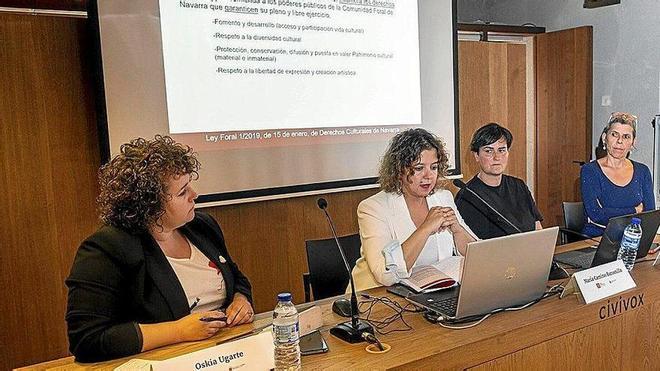 Los retos de los Derechos Culturales en entornos digitales centraron el análisis de Maider Maraña, de la Fundación Baketik. La segunda parte de la jornada se desarrolló en formato de mesa redonda en torno al tema Vías para llevar a la práctica el marco de los Derechos Culturales. María Camino Barcenilla, del Gobierno de Navarra, expuso las líneas de la Ley Foral de Derechos Culturales de Navarra que contiene aspectos pioneros en el ámbito europeo. Amagoia Gurrutxaga, de Lanartea, dio voz al colectivo de profesionales del euskera y sus dificultades para acceder a e sos derechos. A la situación del tejido cultural euskaldun en Iparralde dedicó dedicado su intervención Terexa Lekumberri, de EKE - Euskal Kultura Erakundea.