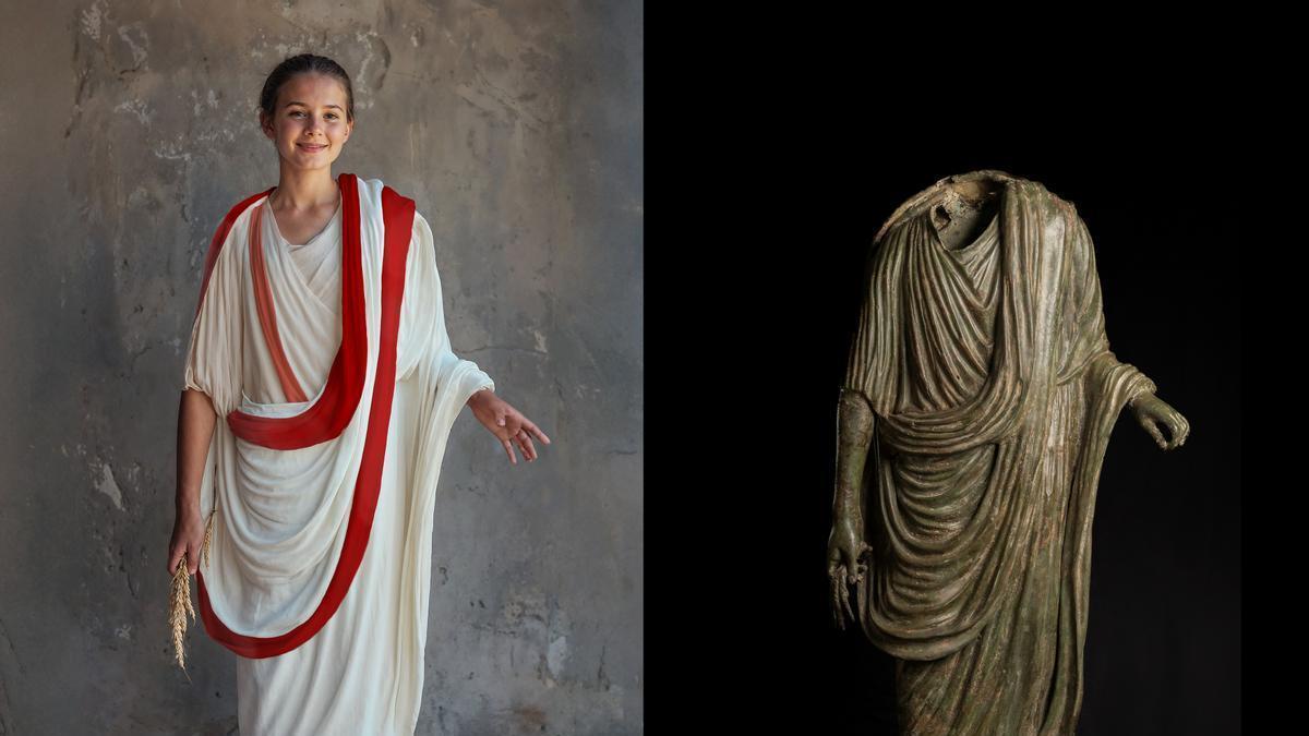 Una imagen a gran tamaño destaca el atributo que la Togada lleva en su mano derecha, el haz de espigas, y también se presenta una fotografía hiperrealista, realizada utilizando técnicas de IA, que intenta acercarnos de manera hipotética a cómo podría haber sido esta ciudadana romana de la Pamplona de la primera mitad del siglo I.