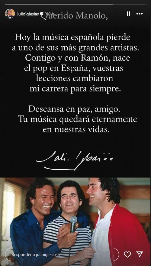 Mientras, a través de las redes sociales, el cantante Julio Iglesias también se ha despedido de Manolo de la Calva y ha lamentado que la música española "pierde a uno de sus más grandes artistas". "Querido Manolo, contigo y con Ramón, nace el pop en España, vuestras lecciones cambiaron mi carrera para siempre. Descansa en paz, amigo. Tu música quedará eternamente en nuestras vidas", ha señalado Iglesias en su perfil de Instagram, donde ha acompañado el texto de una imagen en la que aparece con los dos integrantes del Dúo Dinámico.