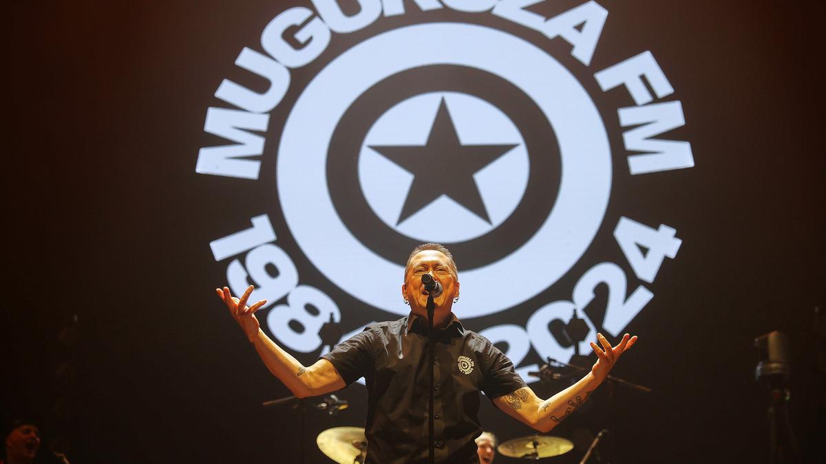 El trío se despedía y, a sus espaldas, unas diez personas comenzaron a poner a punto el escenario para la actuación de Muguruza. Ellos también tuvieron que trabajar a contra reloj, igual que lo estaban haciendo los camareros de las barras, que no daban abasto para abastecer a la sedienta muchedumbre. Por edad, muchos de los que allí esperaban podrían haber estado en el Anaitasuna el 1 de octubre de 1988, aunque también había una parte del público que ni siquiera habría nacido cuando Kortatu, o incluso Negu Gorriak, cesaron su andadura. Mientras se proyectaba un vídeo con las portadas de todos los discos que ha grabado en estos cuarenta años, los músicos salieron y se pusieron a tocar los primeros acordes de Maputxe. Aquello sonaba a gloria, con cuatro metales, un batería y un percusionista que en las tres horas siguientes demostraron ser infatigables. Había también guitarra, bajo, trikitixa y una corista.