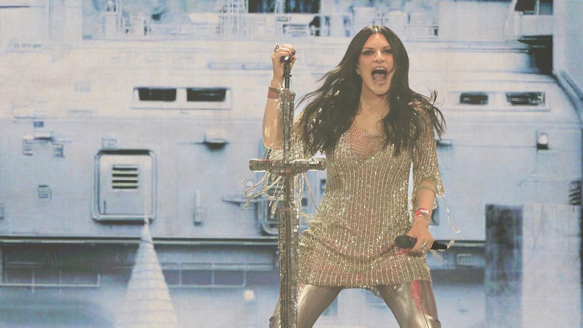 Las pantallas gigantes del escenario proyectaron la imagen de un castillo medieval, una fortaleza visual que marcó el concepto escénico de la noche: la música como reino propio. En ese instante apareció Laura Pausini, vestida con pantalones plateados y una prenda de lentejuelas del mismo tono que evocaba una cota de malla contemporánea.