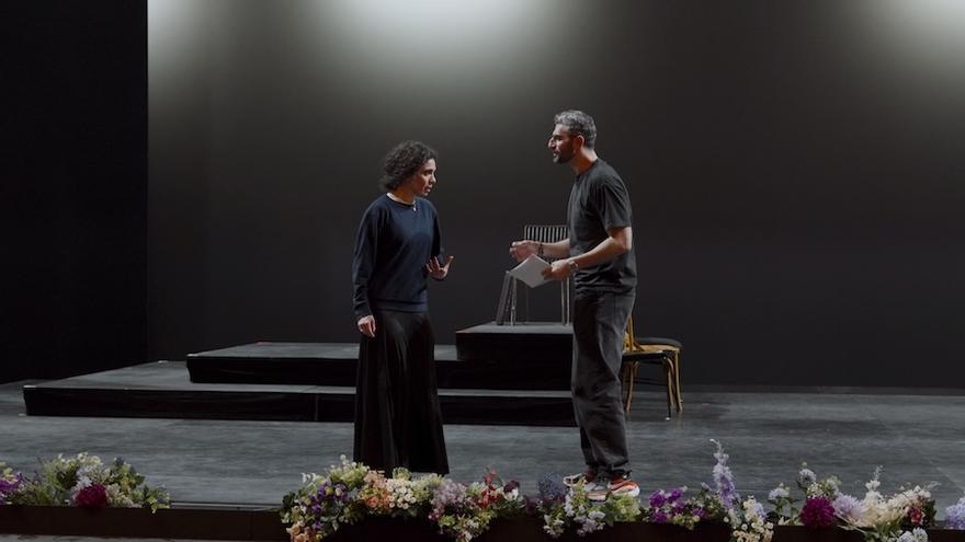 La ambiciosa coproducción del Mun y dos fundaciones de los Emiratos, quiere ser el espectáculo total, y a fe que pone, generosamente, todos los elementos para ello: orquesta en el foso, con el director titular y un buen pianista; un buen ballet con un prestigioso bailaor el frente del reparto, un elenco flamenco de cante y toque, una cantante árabe, un coro de cámara, un recitador de textos en árabe de voz cavernosa pero clara, decorados, vestuario, luces…, y unos media (proyecciones) que incluyen hasta fotos antiguas de la Alhambra del propio museo. Porque la historia tiene la Alhambra y sus jardines de fondo. “La lluvia teje brocados y colores y hace creer que hay túnicas bordadas en las flores del jardín” (Ibn Al-Yayyab, Patronato de la Alhambra 1994). Ya desde que vemos la nómina de los implicados y la producción, el mensaje de entendimiento de las dos culturas (árabe y occidental) está claro a nivel personal, con la historia que se nos expone, y a nivel institucional: Mun, Khawla Art & Culture de los Emiratos A, Unidos, La Music and Art F. de Abu Dhabi, y Falla 150 aniversario. El desarrollo, por razones obvias, es complejo, y, el planteamiento, en algunos aspectos, queda algo abigarrado, quizás imitando los arabescos, pero con algunos elementos de sobra: tarima de tres escalones que quita espacio al ballet, atrezo de flores y cestos (las proyecciones ya son potentes y coloristas)…, pero, en fin, todo quería mostrarse explícito.