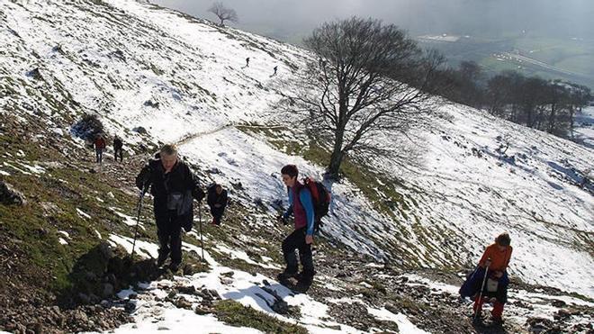 por Madotz, Baraibar, Iribas o Guardetxe, y sobre todo por Uharte Arakil alrededor de un millar de montañeros ascendieron a San Miguel de Aralar con motivo del Mendigoizaleen Eguna, una fiesta que tiene fecha fija, el domingo anterior a la Navidad. También lugar. Este mitico monte les recibió de blanco radiante, con una fina capa de nieve y hielo en las zonas sombrías. Y es que el sol también se apuntó a esta celebración, rozando el mercurio los tres grados.