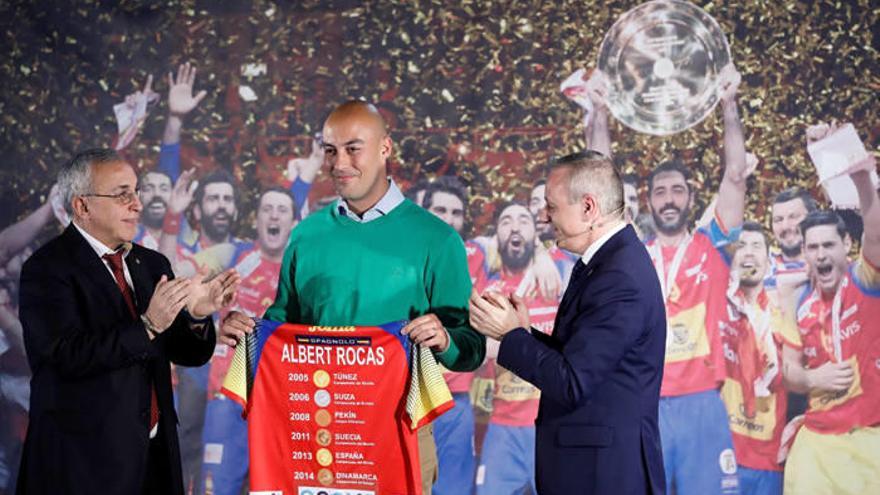 En su despedida le acompañó Alejandro Blanco, que recordó que la Real Federación Española de Balonmano (RFEBM) es un “modelo” ya que ha demostrado ser “más que un equipo”. Además, hizo entrega de la camiseta que usaron los Hispanos en Croacia con todas las medallas que ganó Albert Rocas.