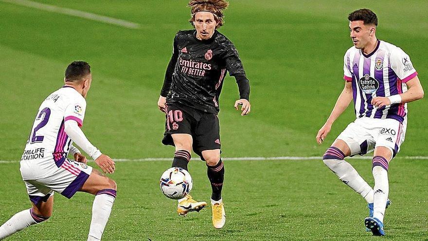 Un gol de cabeza de Casemiro en el minuto 65, en una falta lateral sacada por Kroos, permitió al Real Madrid sumar los tres puntos en su visita al Valladolid, y acercarse a 3 puntos (con un partido más) del líder Atlético de Madrid. El equipo de Zinedine Zidane dominó la primera parte, pero sin crear muchas ocasiones, y apretó más el acelerador en la segunda mitad hasta que llegó el gol. Con la derrota, el Valladolid continúa en la penúltima posición. En la imagen, Luka Modric ante dos jugadores locales.