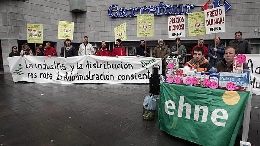 pamplona. Representantes EHNE se concentraron ayer frente a una gran superficie en Pamplona, donde aseguraron que la industria y la distribución están "robando" tanto a productores como a consumidores, mientras la Administración "permanece impasible".