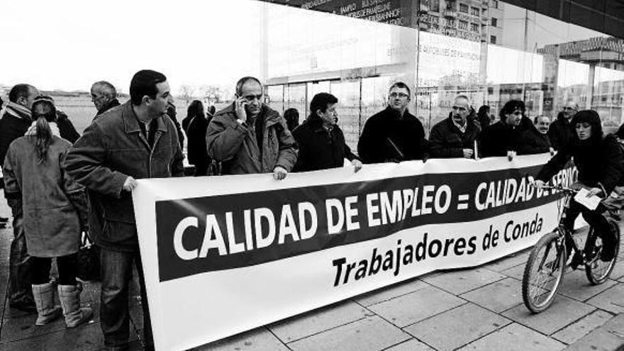 pamplona. Empleados de Conda se concentraron ayer en la entrada de la Estación de Autobuses para reivindicar un cambio en las condiciones de trabajo, "las cuales han empeorado", explicaron ayer fuentes sindicales. El comité de empresa, compuesto por cinco delegados de ELA, dos de UGT y dos de CCOO, convocaron una concentración de dos horas (de 15.00 a 17.00 horas) para protestar por la actual situación que atraviesa la plantilla -cerca de 115 empleados distribuidos entre Pamplona y Tudela-. "Si la empresa no se sienta a negociar las mejoras laborales, convocaremos paros antes de navidades y en las mismas fiestas", avisaron. Foto: javier bergasa
