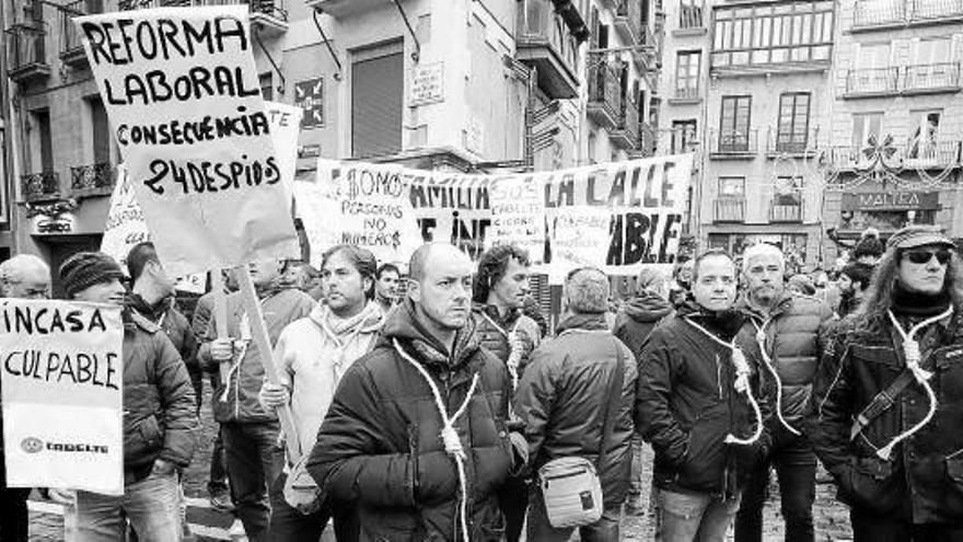 24 despidos. Trabajadores de Incasa Cabelte escogieron ayer la procesión de San Saturnino en el centro de Pamplona para protestar por los 24 despidos que ha planteado la empresa. Somos personas, no dinero, Cabelte culpable o Reforma laboral, consecuencia: 24 despidos fueron algunos de los lemas que podían ser leídos en las pancartas que portaban los trabajadores. El sindicato ELA ha advertido de que los despidos esconden un proceso de deslocalización de la actividad productiva. Foto: Javier Bergasa