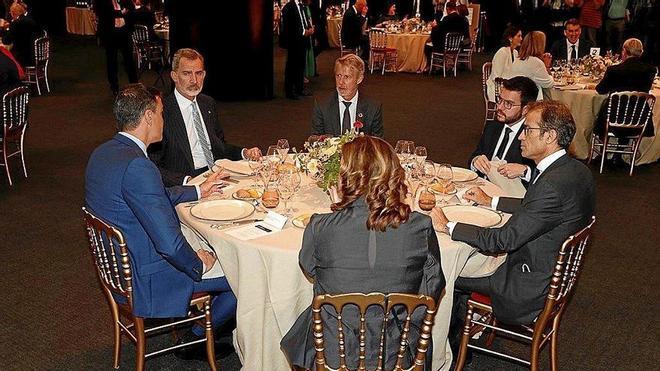 Aragonés esperó en un lateral de la sala a que tuviera lugar el besamanos y, una vez concluido, se sumó al cóctel que precede a la cena, aunque ya sin presencia de los medios gráficos, y fue ahí donde se les vio conversar brevemente. En la cena, el president y la alcaldesa compartieron mesa con Felipe VI, Sánchez, Granryd y el presidente de Fira, Pau Relat.