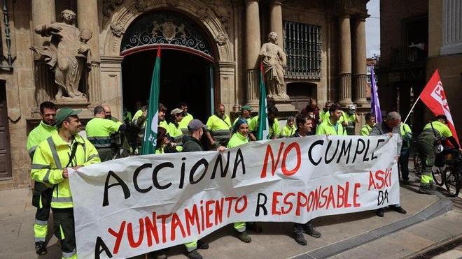 Trabajadores de Acciona Medio Ambiente, la empresa que gestiona el mantenimiento de las zonas verdes de Pamplona, se han concentrado este viernes frente al Ayuntamiento de Pamplona para exigir la negociación de un convenio propio.