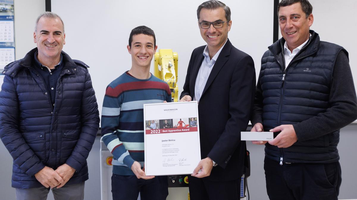 Javier Ibiricu Elizondo, tafallés de 21 años, técnico en Automatización y Robótica Industrial (CIP Tafalla), ha sido reconocido con el premio al Mejor Aprendiz 2022 de Volkswagen Navarra. En todo el Grupo, el galardón ha sido concedido este año a cerca de medio centenar de jóvenes de 20 nacionalidades distintas. El navarro -especialista en Automatización y Redes Industriales- trabaja actualmente en la nave de Chapistería de la empresa de Landaben.