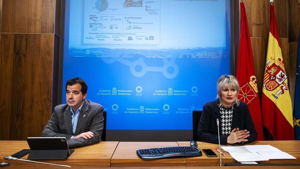 El consejero de Desarrollo Económico y Empresarial, Mikel Irujo, y la directora general de Turismo, Comercio y Consumo (DGTCC), Maitena Ezkutari, han expuesto las cifras y datos recabados por el Observatorio Turístico de Navarra sobre el comportamiento del conjunto del sector el año pasado. Además, han explicado la labor desarrollada por la DGTCC y los objetivos que se persiguen de cara a este 2023, que se financiarán con los fondos Next Generation.