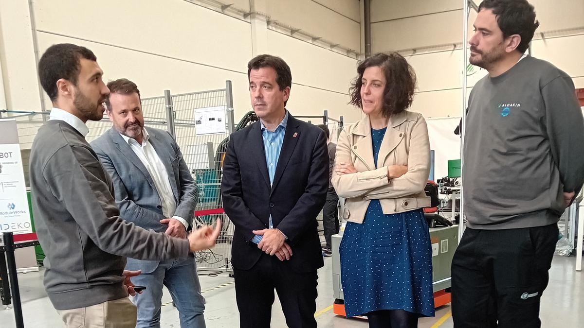 El consejero de Industria y de Transición Ecológica y Digital Empresarial Mikel Irujo; el director de Fomento Empresarial, Íñigo Arruti; y la directora general de Energía I+D+i empresarial y Emprendimiento, Uxue Itoiz; han visitado este lunes la sede central de Aldakin en Altsasu para conocer de primera mano las diferentes células robóticas, robots colaborativos y robots móviles en los que está trabajando la empresa.