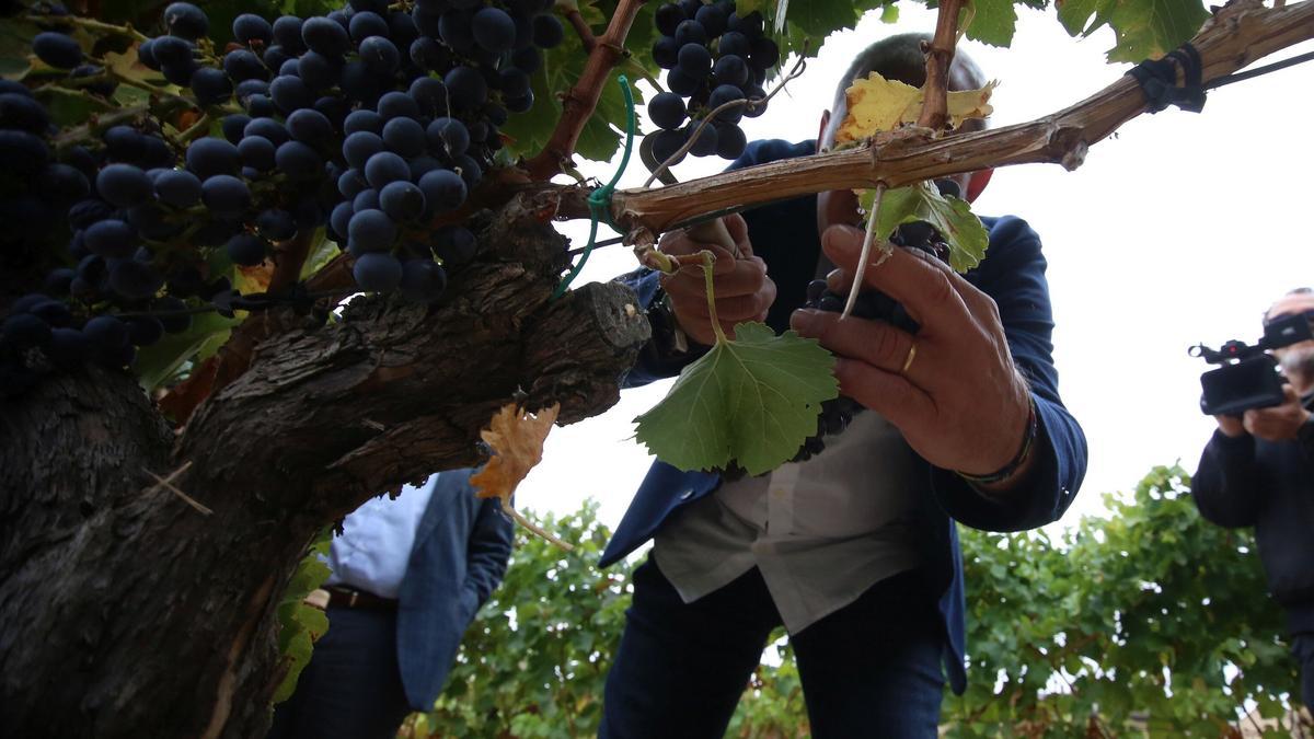 El consejero de Desarrollo Rural y Medio Ambiente del Gobierno de Navarra, José Mari Aierdi, y el presidente del Consejo Regulador de la DO Navarra, David Palacios, han participado hoy viernes en Olite / Erriberri en el tradicional acto del corte del último racimo que pone fin a la vendimia de esta campaña.