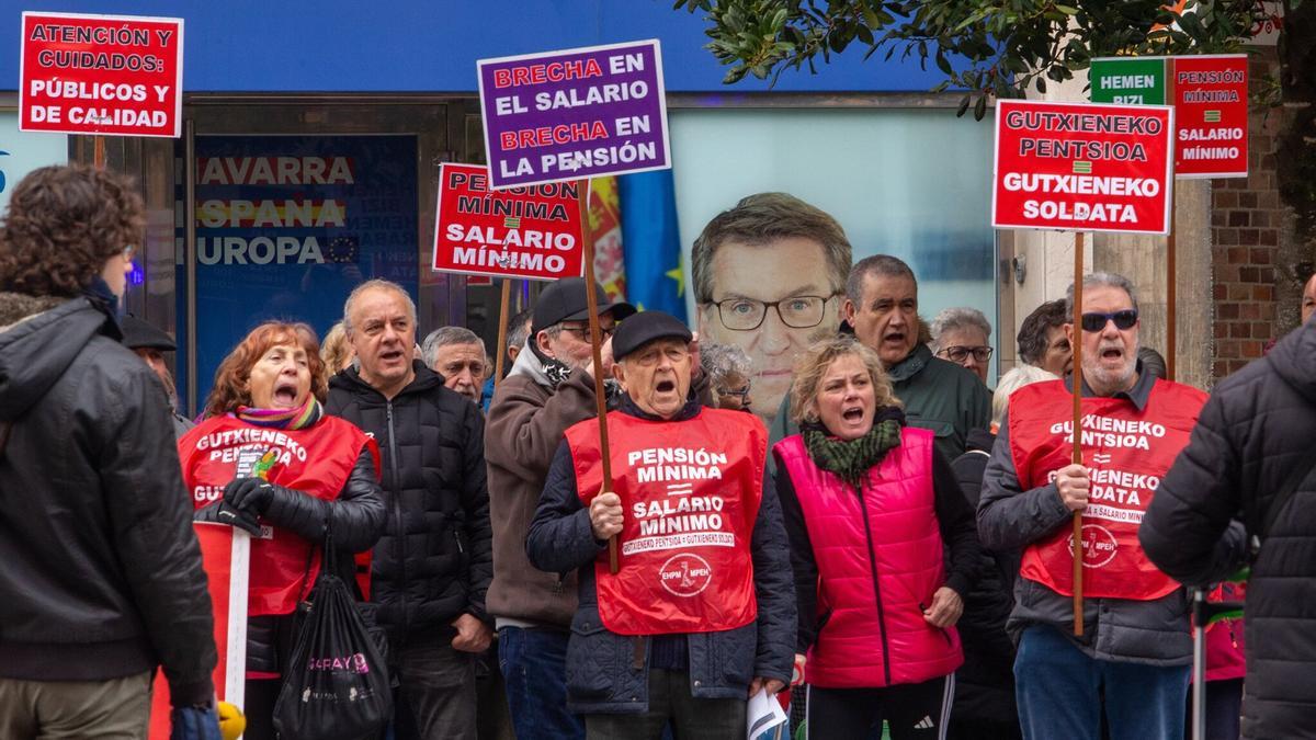 Un centenar de pensionistas se manifestó ante las sedes del PP y de UPN en Pamplona para exigir la revalorización de las pensiones, después de que el martes el Congreso de los Diputados derogara el real decreto ley ‘ómnibus’ que incluía la subida con los votos en contra de ese texto de esos dos partidos y de Vox y Junts.