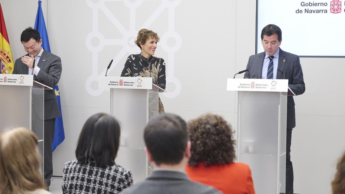 La presidenta del Gobierno de Navarra, María Chivite; en consejero de Industria y Transición Ecológica y Digital Empresarial, Mikel Irujo, y el director de Inversiones de Hithium, Hao Wang, han intervenido en una rueda de prensa para presentar el proyecto, celebrada en la sala multiusos del Palacio de Navarra.