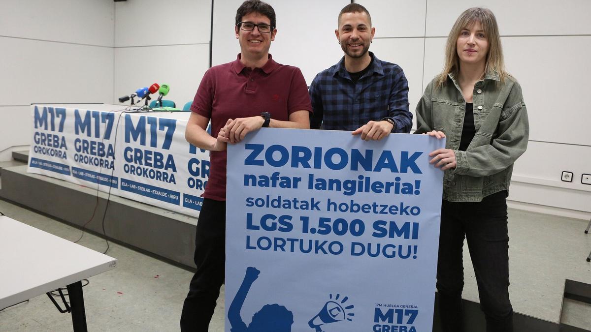 El coordinador de ELA en Navarra, Imanol Pascual; el responsable de LAB en la Comunidad Foral, Imanol Karrera, y la representante de Steilas Ane Apezetxea, han comparecido en Pamplona para analizar los resultados del paro de este martes. " El salario mínimo propio (SMI) y, en general, el reparto de la riqueza se ha situado en el centro del debate político y social, con la voz de la clase trabajadora navarra escuchada en las empresas y en la calle", han destacado en un comunicado conjunto.