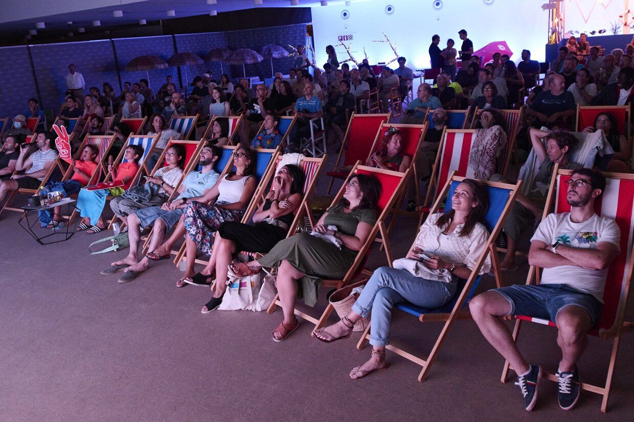 Baluarte ha acogido esta noche la primera proyección del ciclo Zinema Beach, que llega en el marco del veinte aniversario del auditorio pamplonés y coincidiendo con el décimo cumpleaños del programa RoofTop Cinema. La sala de exposiciones se ha transformado, y así lo hará las siguienes noches del ciclo, en una auténtica playa. No han faltado la arena, la recreación de ambiente marino a través de pantallas led, 150 hamacas y sillas de tela, 150 sillas de chiringuito, una zona con comida veraniega, un motocarro de helados o una zona de recreo para practicar vóley-playa, todo ello acompañado por una decoración con motivos playeros. Además, el público ha podido cenar o tomar y picar algo previamente en la zona de chiringuitos.