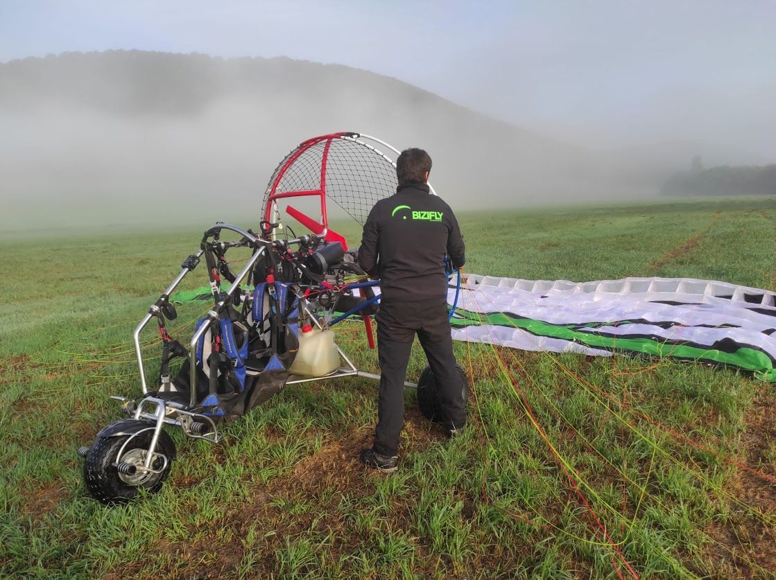 David Pérez y María Puñal, vecinos de Olagüe, pusieron en marcha el pasado mes de abril su empresa, en la que ofrecen durante todo el año vuelos de media o una hora en un parapente biplaza con motor.