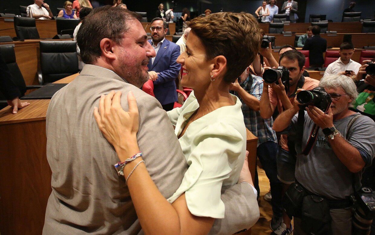 Ver galería >La candidata del Partido Socialista, María Chivite, ha sido reelegida este martes presidenta de Navarra con los votos de PSN, Geroa Bai y Contigo Zurekin, además de la necesaria abstención de EH Bildu, en segunda votación. Chivite defendió este lunes su candidatura frente a los parlamentarios y parlamentarias forales, pero en una primera votación no le otorgaron la mayoría absoluta que necesitaba para ser elegida presidenta. Con 50 asientos en el Parlamento foral, Chivite ha repetido el resultado de este lunes con los 21 apoyos de los tres partidos que han firmado el pacto de Gobierno, PSN (11), Geroa Bai (7) y Contigo-Zurekin (3), mientras que EH Bildu (9) se ha abstenido. Ha sumado 20 votos en contra, los de UPN (15), PP (3) y Vox (2). En esta ocasión, con lograr más votos a favor que en contra era suficiente. Tras la votación, Chivite a recibido las felicitaciones de sus compañeros y familiares.