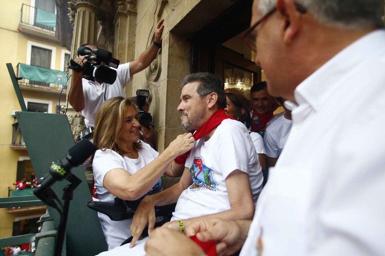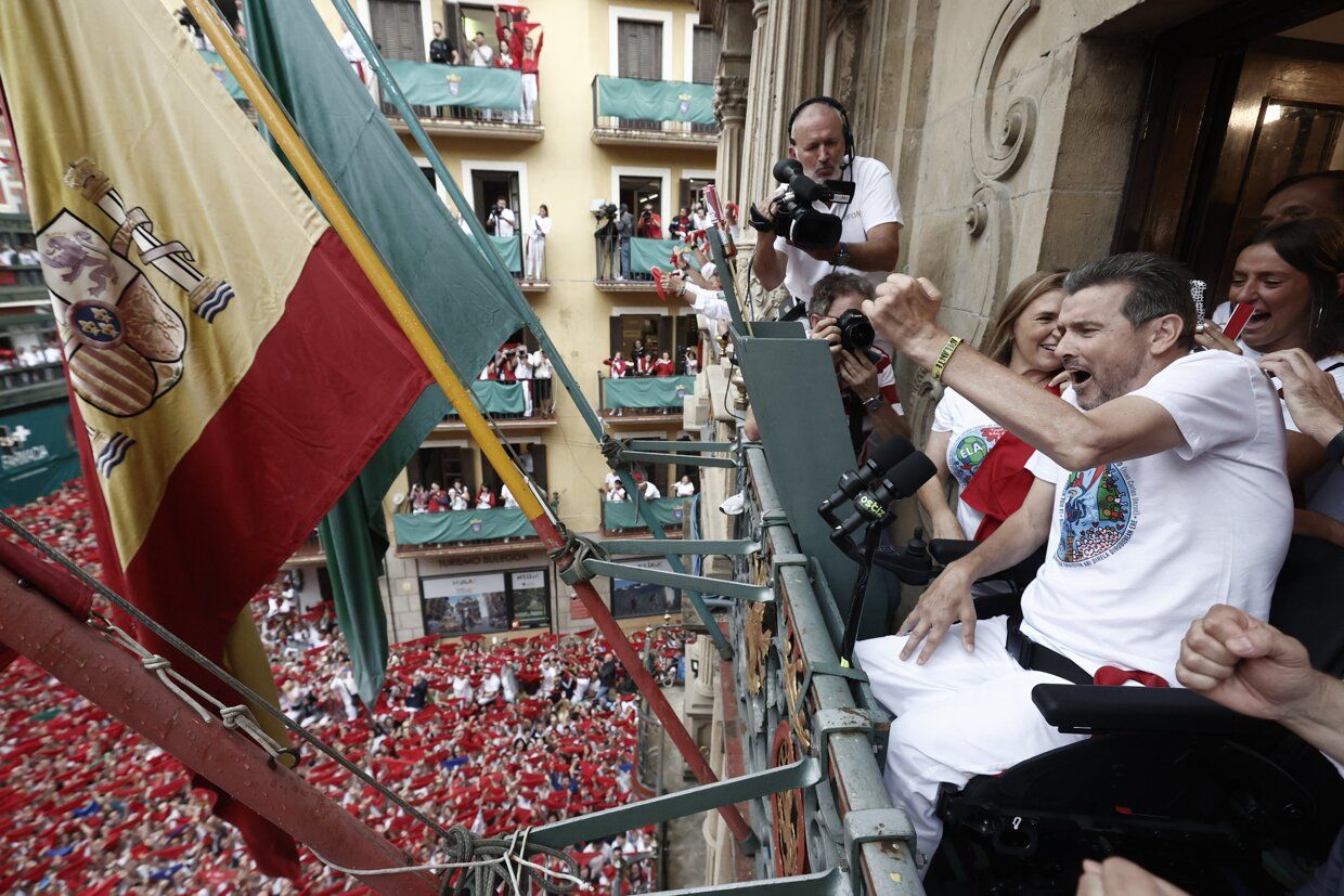 Imágenes del lanzamiento del Chupinazo por parte del exfutbolista navarro Juan Carlos Unzué.