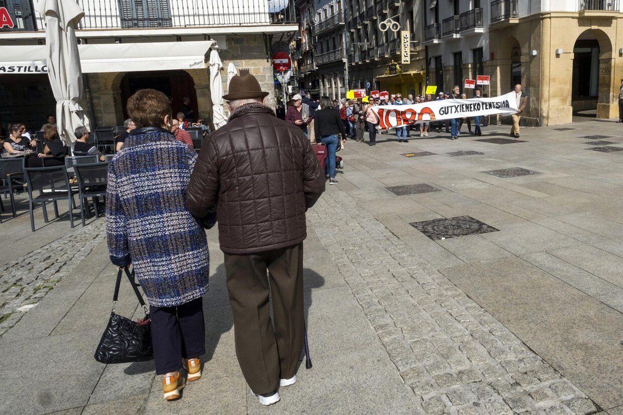 El movimiento de Pensionistas de Iruñea se ha manifestado ese lunes en Pamplona para reclamar que todas las pensiones lleguen al menos a los 1.080 euros mensuales en 14 pagas.