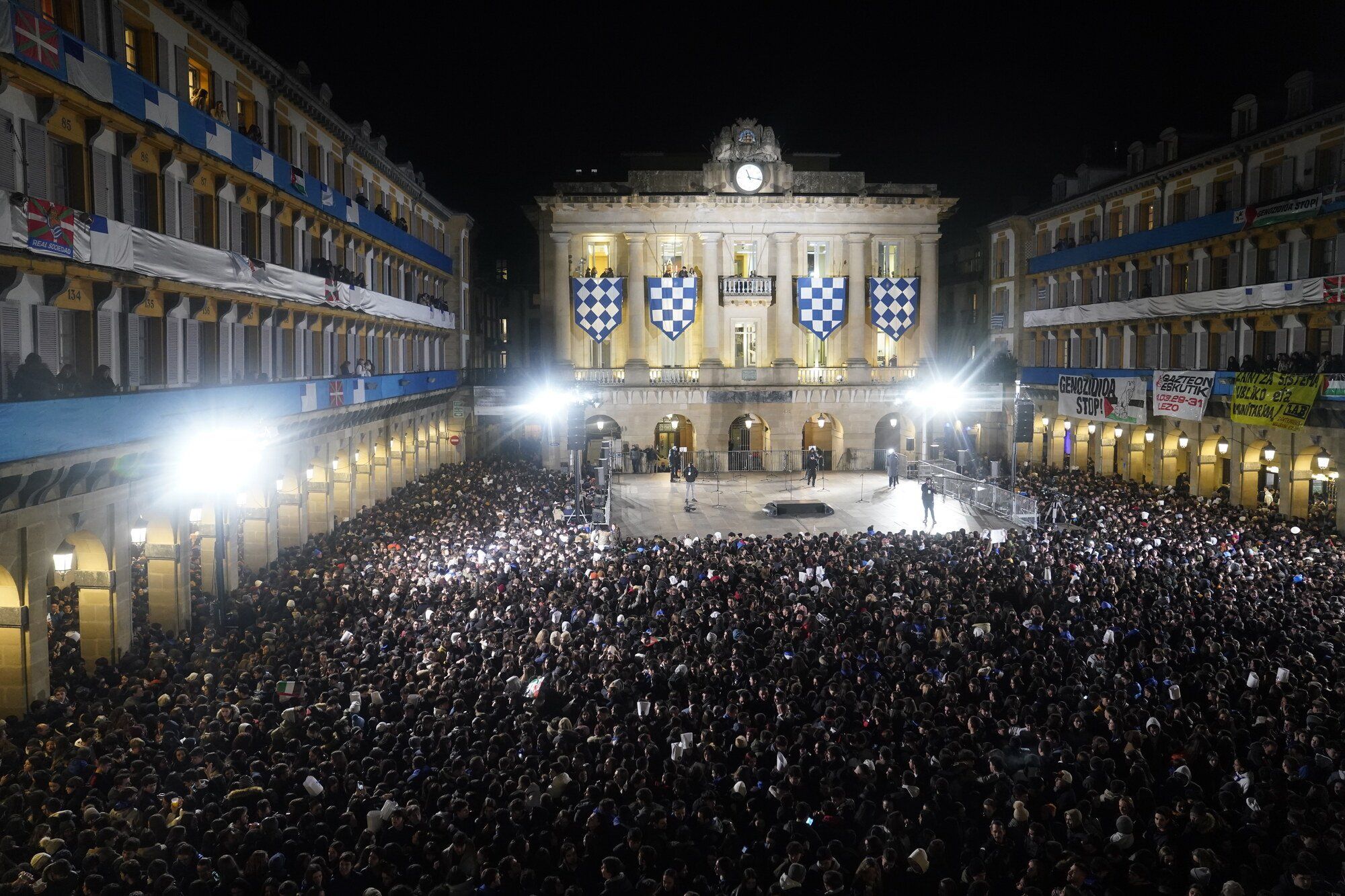 Ver galería >Miles de personas inundaron anoche la plaza de la Constitución para asistir a la ceremonia de la Izada de la bandera de Donostia, que dio inicio al Día de San Sebastián en la capital guipuzcoana.