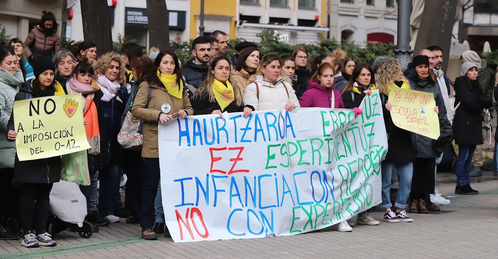 Trabajadores de la escuela infantil de Burlada y del colegio Hilarión Eslava se manifiestan en contra de la implantación del 0-12 años en el colegio para el curso 2025-2026.