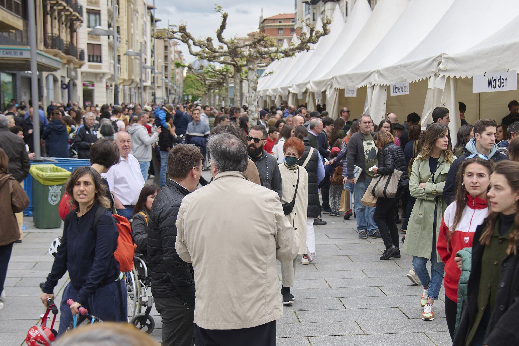 Las librerías de Pamplona han acercado un año más la lectura a la ciudadanía a través de puestos en la avenida Carlos III, en el cruce con la avenida de Roncesvalles, en el Día del Libro y de la Flor. La lluvia ha respetado el inicio de una jornada en la que cientos de personas se han acercado desde las 10:00 horas a las carpas. Las librerías dan asesoramiento sobre nuevas lecturas y ofrecen sus libros con un 10 % de descuento. Las jaimas abren hasta las 21 horas.