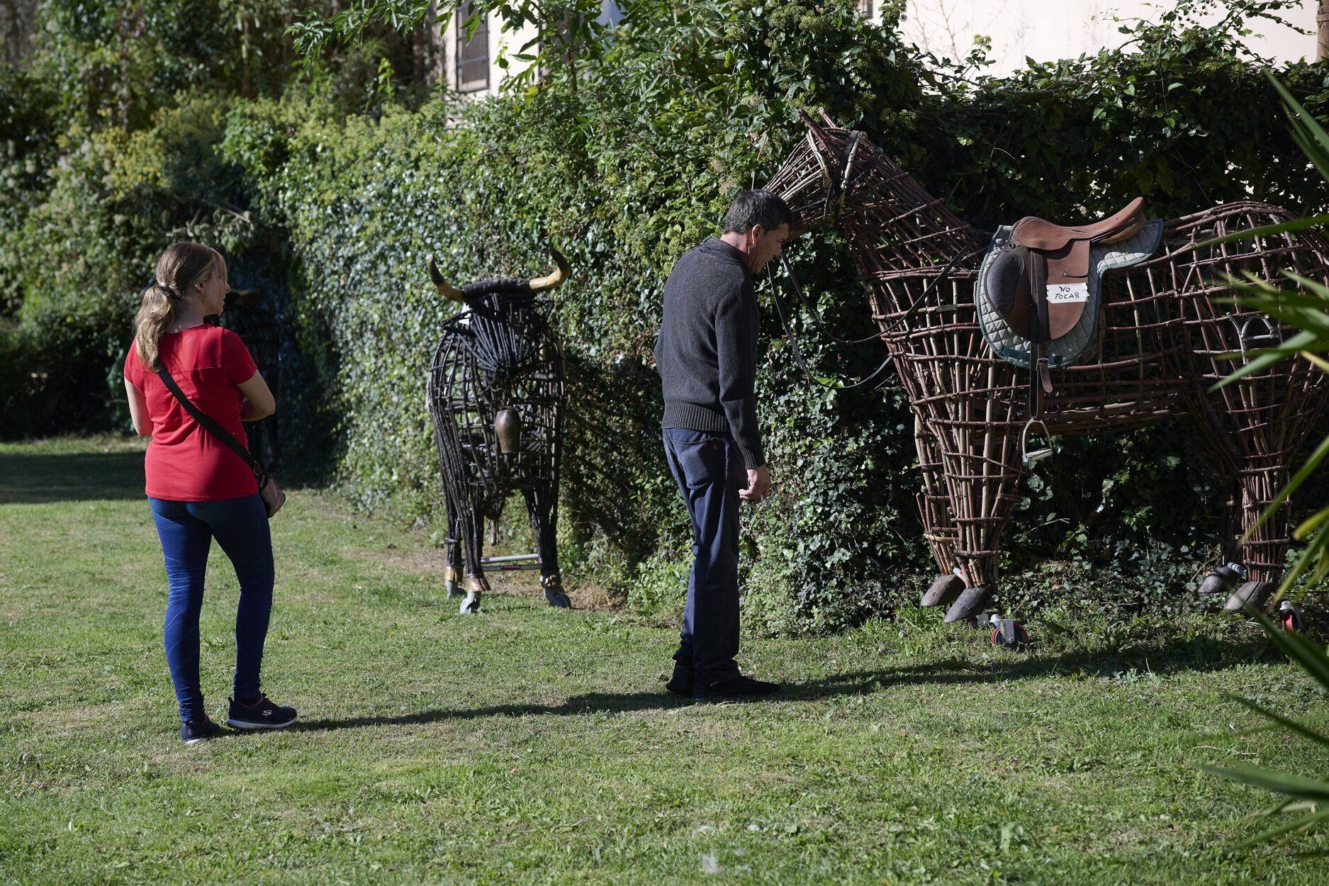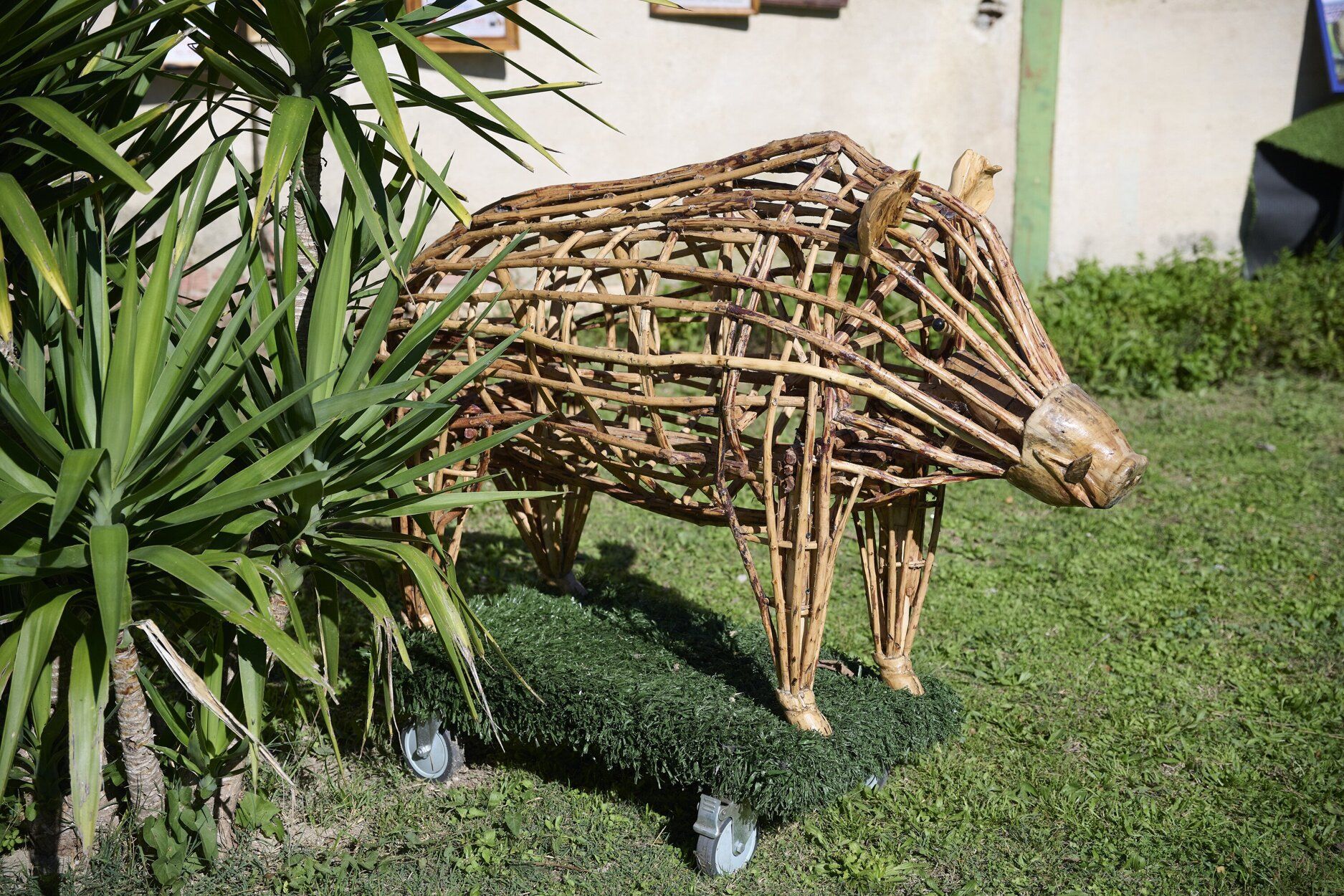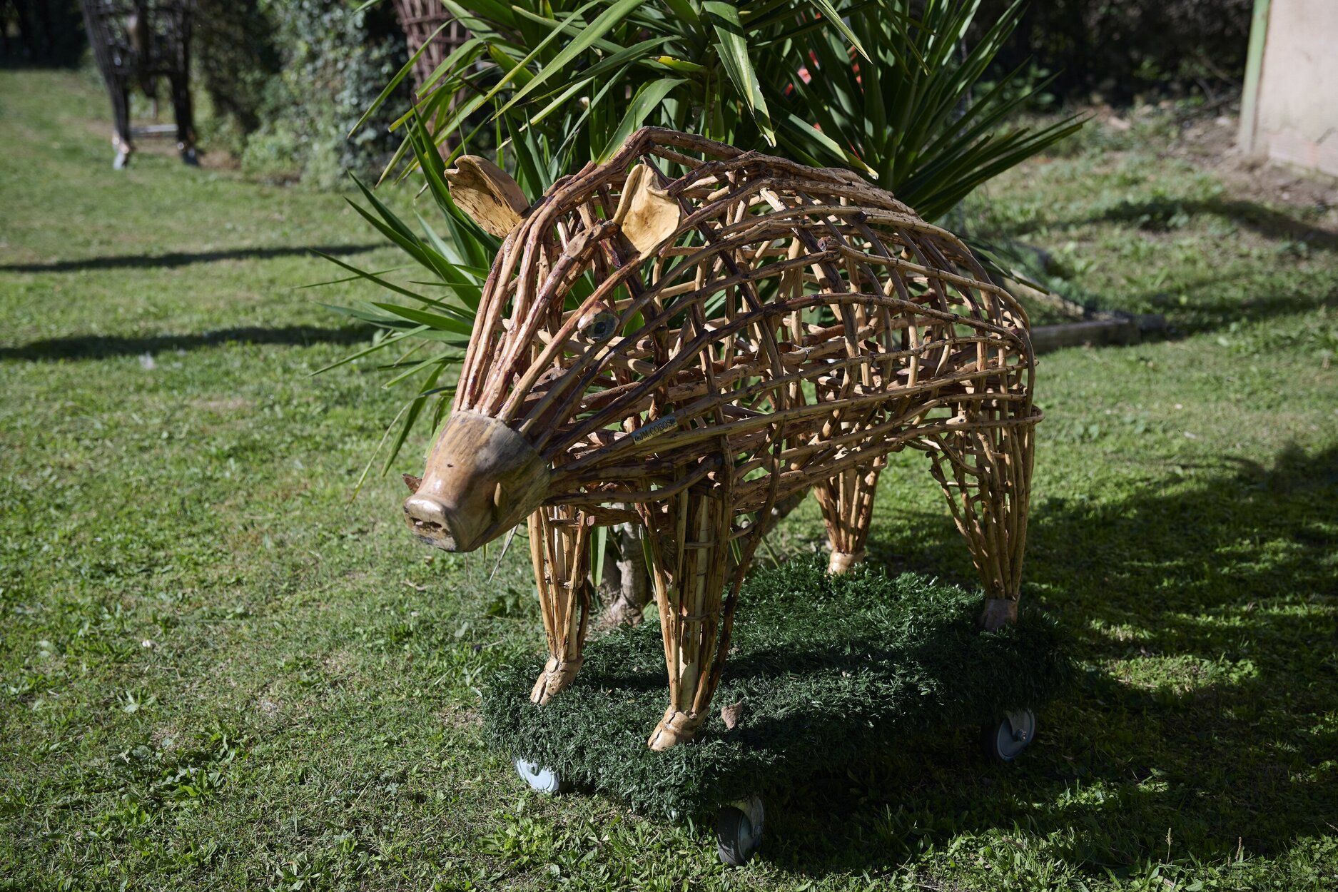 La nieta de Juanma Cobo le pidió como mascota un caballo, el abuelo le diseñó uno a tamaño real con ramas y también creó dos toros, un jabalí, un ciervo, una jirafa o un elefante que echa agua por la trompa.