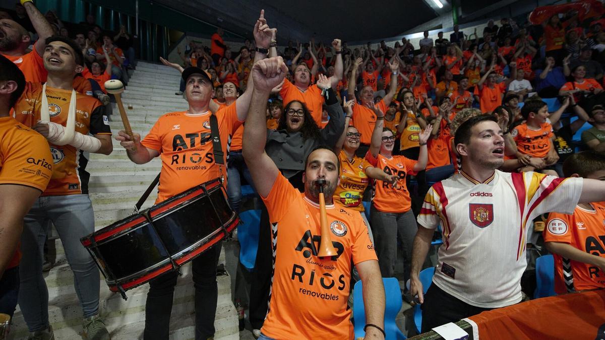 Un total de 2.312 espectadores fueron testigos de uno de los derbis más cruciales de las últimas temporadas. Unos 400 de ellos llegados desde la Ribera Navarra. El color naranja tiñó una de las esquinas del pabellón pamplonés, además de varias localidades aledañas. Adultos, niños, jóvenes... Aficionados y aficionadas de todas las edades acompañaron a los suyos hasta Pamplona. Les alentaron en un momento crítico del curso y, al igual que en el Ciudad de Tudela, no dejaron de apoyarles durante todo el partido.