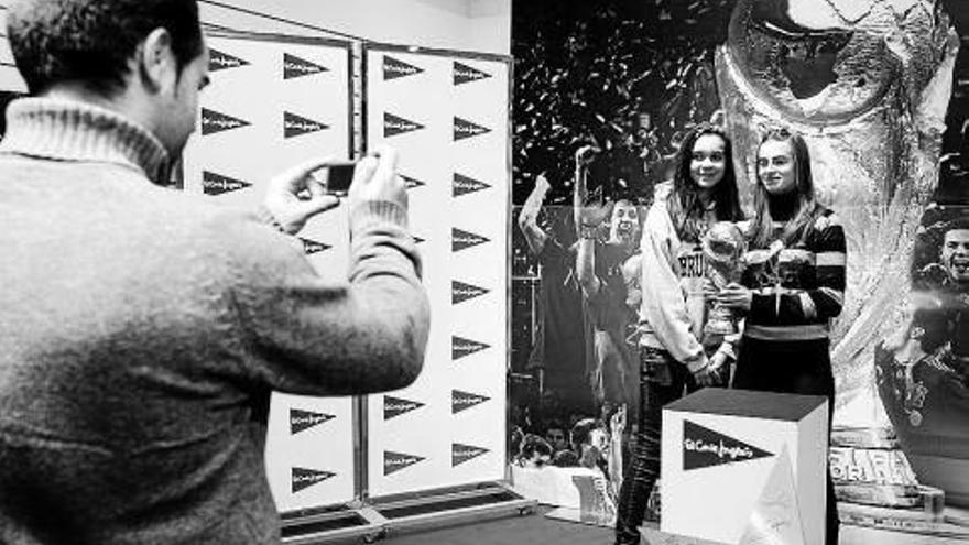 Pamplona. Colas de hasta una hora hicieron ayer los aficionados navarros -con amplia mayoría de niños- para tocar y/o hacerse fotos con la Copa del Mundo en su paso por la Comarca de Pamplona. El trofeo estuvo por la mañana en El Corte Inglés y fue trasladado por la tarde a Itaroa. Este trofeo no el que Iker Casillas alzó tras ganar la selección el Mundial, hecho de oro macizo, porque la FIFA no se desprende de él, sino una réplica, bañada en oro, que se da a la selección campeona, que la conserva hasta que comienza el siguiente Mundial. En todo caso, se trata de una réplica tan llamativa como bien hecha, y que, por supuesto, permite sentirse por unos segundos campeón del mundo. Fotos: Mikel Saiz y javier bergasa