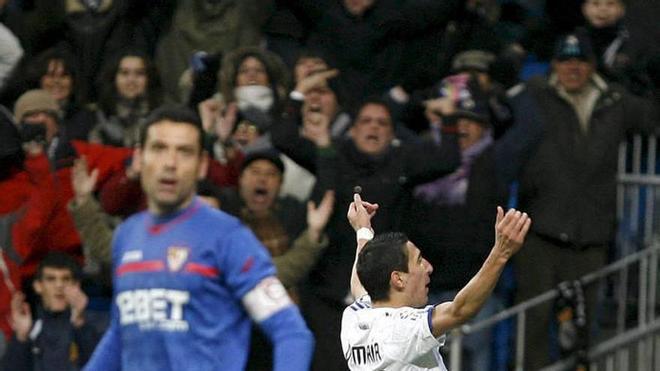 El encuentro fue subiendo de temperatura y un revolucionado Carvalho se marchó antes a vestuarios en otro lance con Negredo. El Bernabéu centró entonces sus protestas en Clos Gómez, que tampoco concedió como penalti un forcejeo entre Granero y Escudé. Con el partido pasado de revoluciones, el Real Madrid buscó la verticalidad por bandas para perpetrar la defensa sevillista y la encontró por medio de Di María, que recogió un balón rechazado por la zaga andaluza y aprovechando un resbalón en la salida de Palop, cerró la victoria y ajusticiar a un Sevilla que encajó su quinta derrota consecutiva.