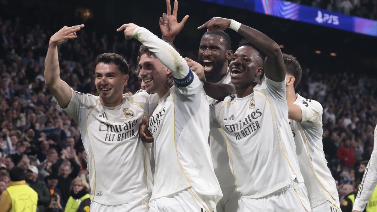 Porque el colmillo afilado era el del Real Madrid. ‘Vini’ volvió a correr a la espalda de Khusanov, Pitarch recibió en la derecha y tras combinar con Brahim Díaz, el marroquí le puso de ‘cuchara’ el gol en bandeja a Fede Valverde, que ponía el 3-0 y completaba su ‘triplete’ particular antes del descanso. En la segunda parte el equipo inglés seguía sin la tensión que exige este tipo de partidos, y cuando estaba muy volcado en campo rival, Arda Güler se inventó un pase largo con la derecha al espacio para que Vinícius encarara a Donnarumma, que cometió penalti sobre el brasileño.