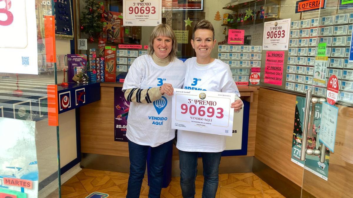 Desde la Delegación han salido en cuatro ocasiones este lunes por la mañana para llevar el cartel a las tres administraciones de lotería y un punto de venta que han repartido dinero. Y en dos de ellos han entregado la camiseta tradicional, en la que se informa de que uno de los tres primeros premios se ha vendido en ese local. En esta ocasión, el 90693 en La Esquina de la Suerte de la avenida Zaragoza de Pamplona -no es la primera vez que celebra en este 22 de diciembre- y en el punto de venta de La Morea, un habitual de esta jornada, ya que todos los años otorga un premio de los grandes. Esta vez, un tercer premio; y en 2024, un cuarto, por ejemplo.
