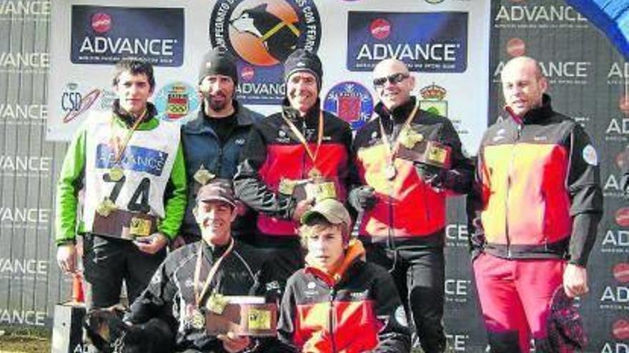 Pamplona. Éstos fueron los medallistas navarros en el Campeonato de España sobre tierra de Vinuesa (Soria). De izda a dcha, arriba: Jorge Ibáñez (1º en 4 nórdicos), Joserra Lebrón (3º en 1), Óscar Fernández (1º en 6), Baltasar Gallardo (3º en 6 nórdicos), Javier Santa Cecilia (3º en 4 nórdicos). Abajo: Javier Alemanno (1º en 4) y Diego Santa Cecilia (3º en 4). Foto: cedida
